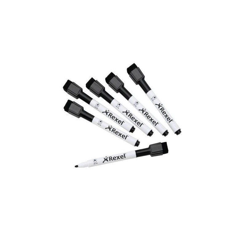 Los rotuladores Rexel disponen de un borrador de borrado en seco en la tapa, y con punta fina de color negro. No solo son rotuladores de olor tenue, utilizan además tinta no tóxica, por lo que son perfectos para su empleo en cualquier entorno, en especial en el hogar o en el colegio. También incorporan una punta de borrador magnética, de forma que puede mantenerlos fijados a su pizarra blanca magnética Rexel y al mismo tiempo poder borrar la pizarra una vez haya finalizado, sin tener que adquirir un borrador o un limpiador de pizarra por separado.