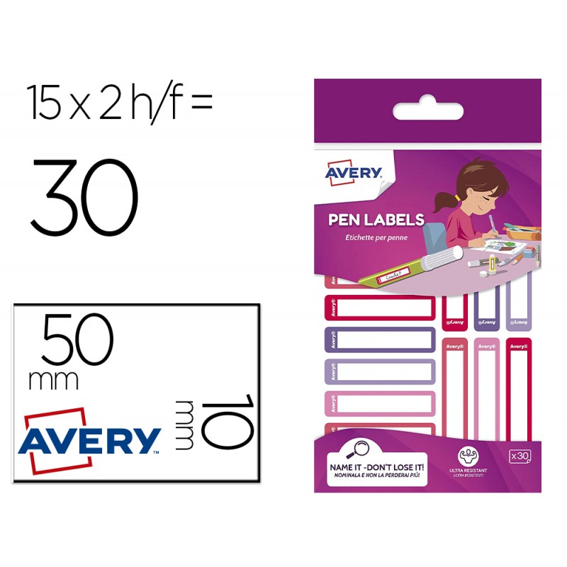 Etiquetas para etiquetar materiales escolar, se adaptan a cualquier superficie, incluso curvas como bolígrafos. Los marcos de las etiquetas son de colores surtido rosa y violeta. 15 etiquetas cada hoja x 2 hojas. Total 30 etiquetas en cada sobre. Escribibles a mano, Adhesivo permanente.