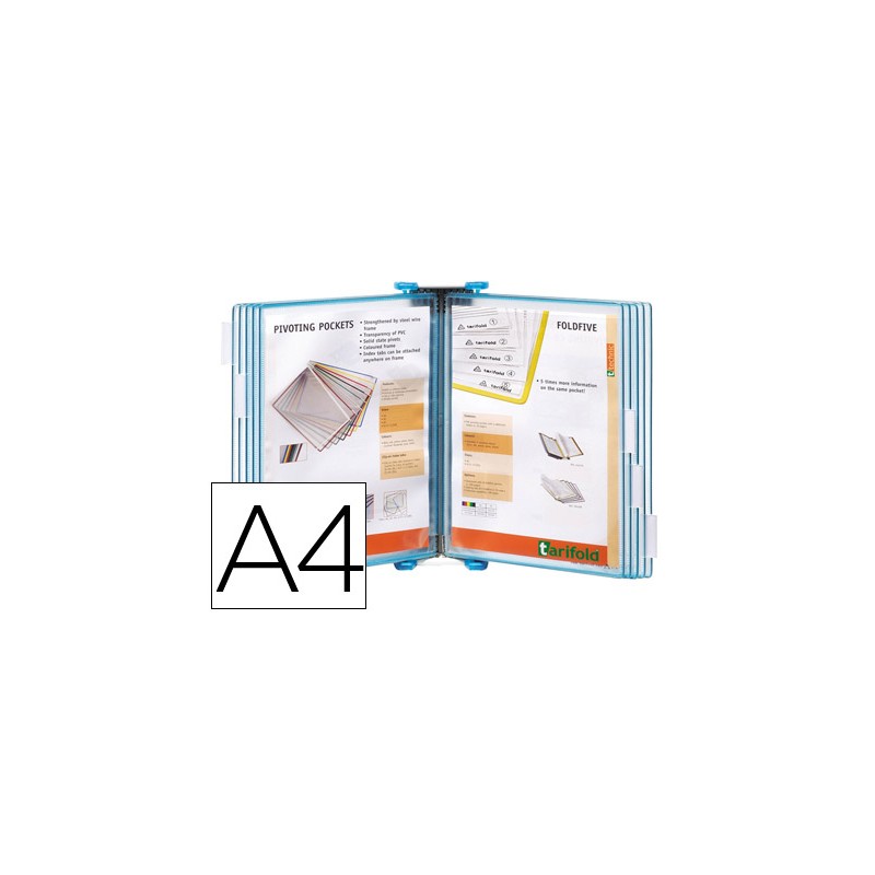 Soporte en metal de alta resistencia con 10 fundas Din A4, fabricadas en PVC en color azul. Incluye 4 topes laterales, para una óptima lectura. Se adapta al volumen de la documentación. Extensión al infinito. Material de fijación: tornillos, tacos y separador.