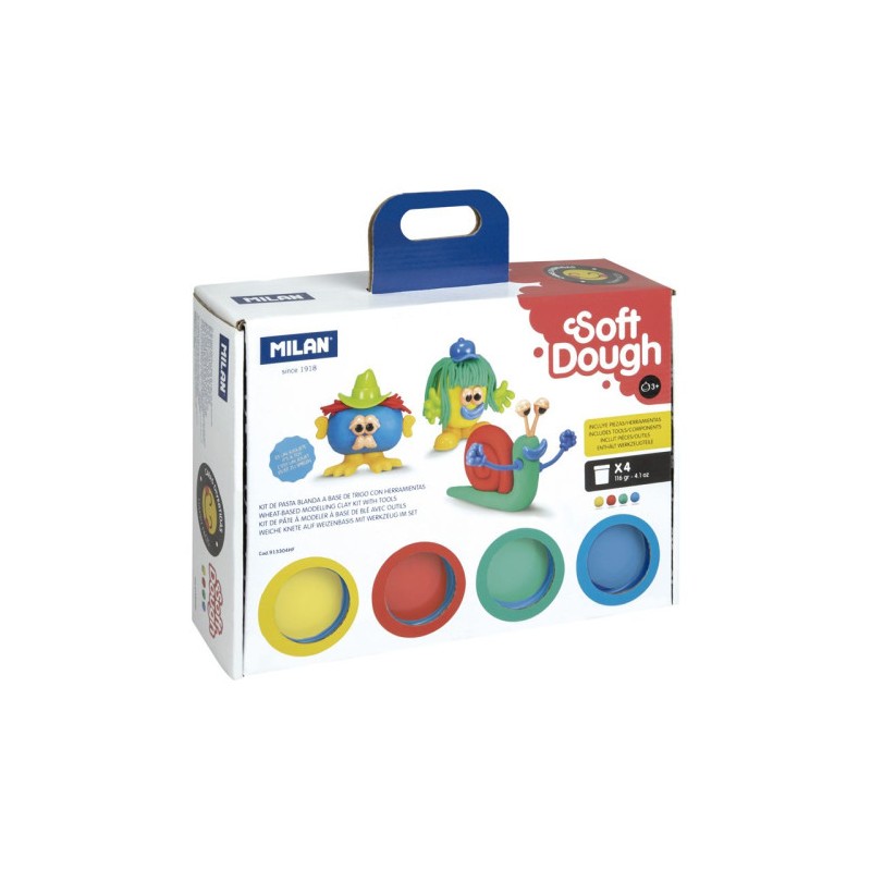 Kit de pasta blanda a base de trigo con herramientas "Caras Divertidas". Contenido del maletín: 4 botes de 116 g (de color amarillo, rojo verde y azul), 27 piezas y 2 herramientas. Soft Dough es una pasta consistente y elástica, fácil de modelar. Se pueden crear nuevos tonos combinando dos o más colores. No deja residuos en las manos. Ingredientes de origen vegetal (contiene gluten).