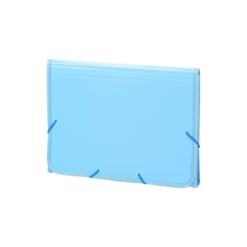 Acordeón de polipropileno Soft reforzado con ribete de tela en todo su contorno color a juego. Color azul pastel.Con 13 departamentos interiores de polipropileno transparente con fuelle tipo acordeón. Incluye etiquetas para identificar el contenido de cada departamento.Goma redonda de cierre del mismo color.Apropiado para todo tipo de documentos tamaño Folio.