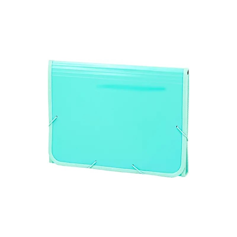 Acordeón de polipropileno Soft reforzado con ribete de tela en todo su contorno color a juego. Color menta.Con 13 departamentos interiores de polipropileno transparente con fuelle tipo acordeón. Incluye etiquetas para identificar el contenido de cada departamento.Goma redonda de cierre del mismo color.Apropiado para todo tipo de documentos tamaño Folio.