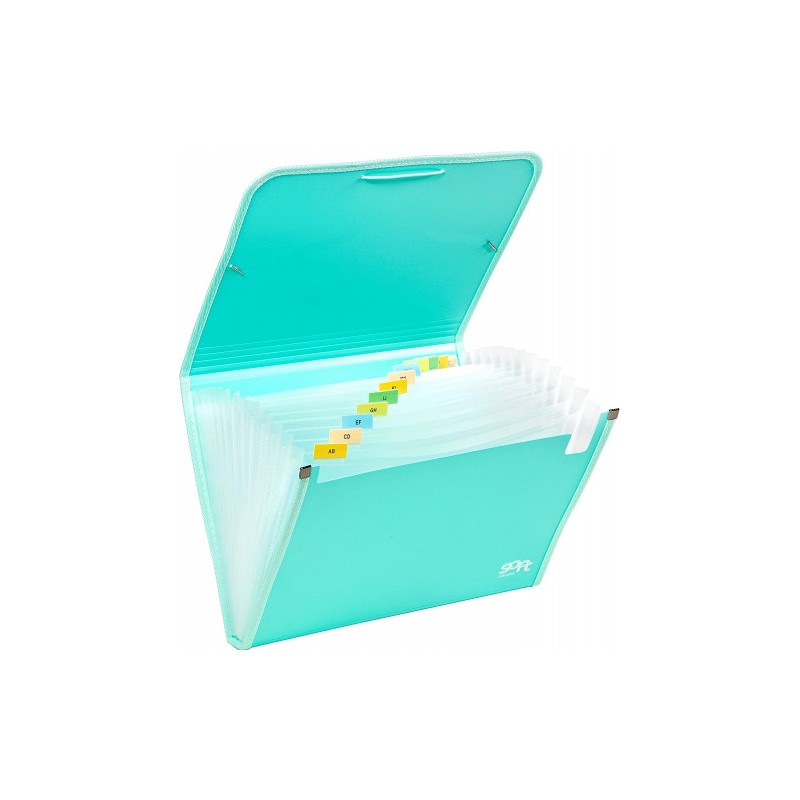 Acordeón de polipropileno Soft reforzado con ribete de tela en todo su contorno color a juego. Color rosa pastel.Con 13 departamentos interiores de polipropileno transparente con fuelle tipo acordeón. Incluye etiquetas para identificar el contenido de cada departamento.Goma redonda de cierre del mismo color.Apropiado para todo tipo de documentos tamaño Folio.
