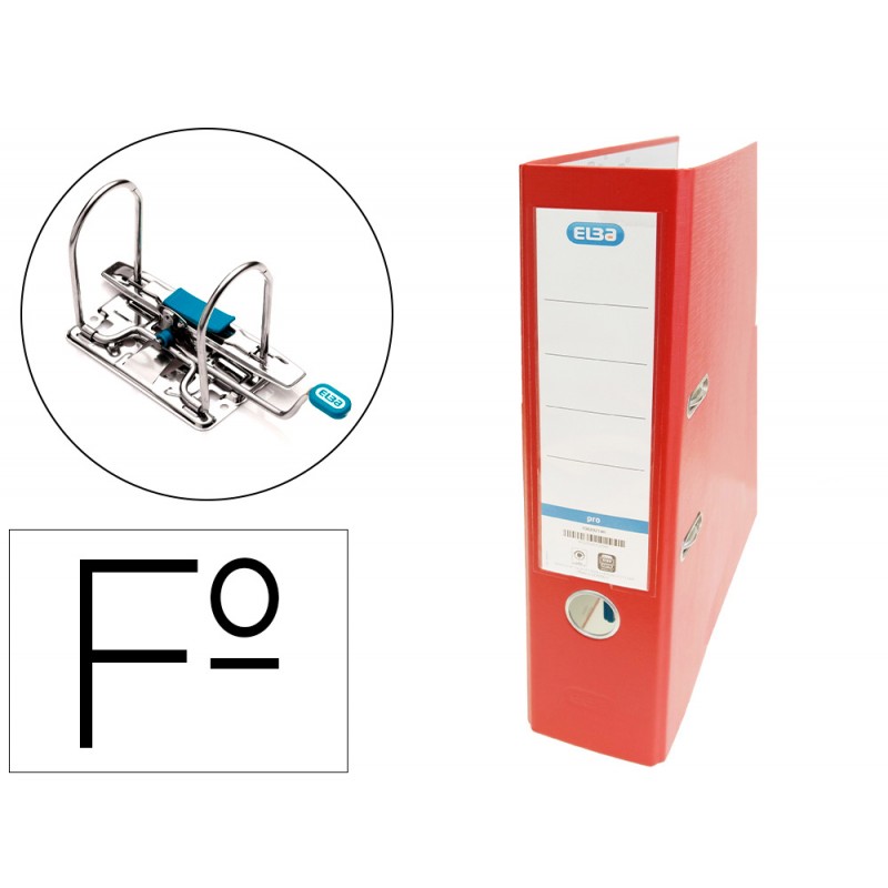 Forrados exteriormente con polipropileno e interiormente con papel. Cantoneras metálicas y sistema rado. Tarjetero en el lomo y etiqueta intercambiable. Lomo ancho de 80mm. Archivador de palanca color lomo 80mm Elba Rado Top folio rojo.