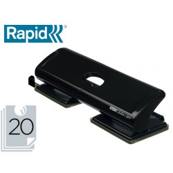 Potente perforadora de metal para 4 agujeros de color negro. Capacidad para taladrar hasta 20 hojas. Ideal para utilizar en la oficina. Espacio entre agujeros: 80 mm. Diámetro del agujero: 5,5 mm. Cuchillas afiladas de gran calidad. Cabe en la mayoría de los cajones. Sin esfuerzo y fácil de usar gracias a su mando de plástico reforzado y sus cuchillas afiladas. Práctica barra guía con marcas de formato que asegura una perfecta alineación del papel. 4 taladros. Color negro. Medidas de la base: 87 x 265 mm.