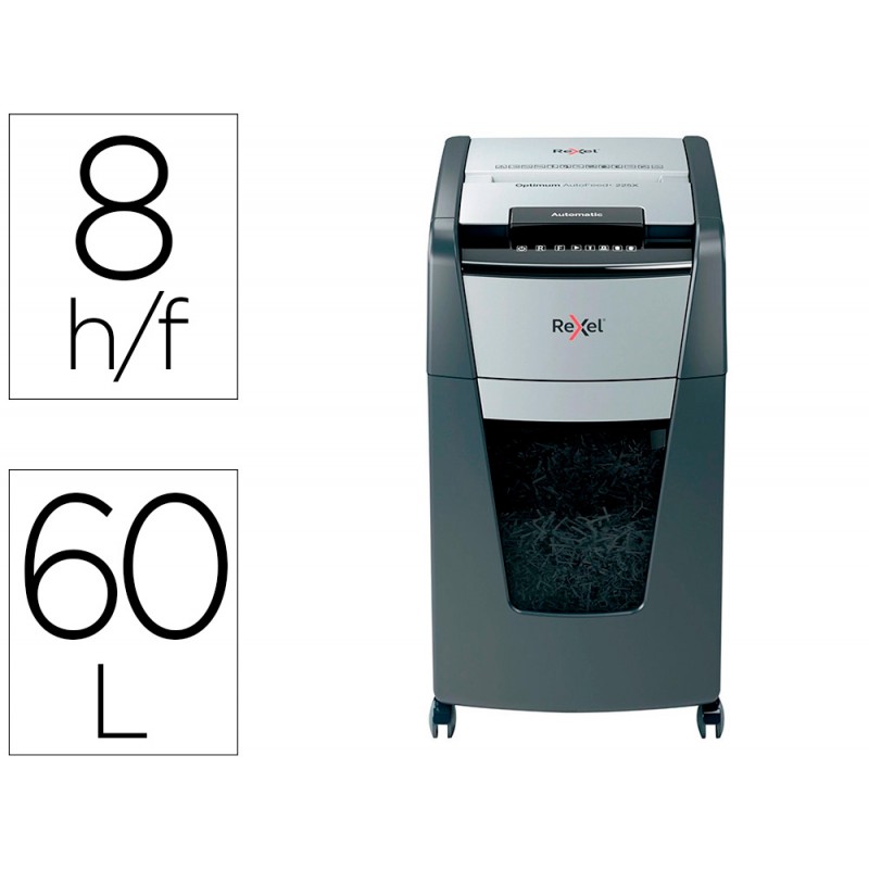 La destructora de corte en partículas Optimum AutoFeed 225X tritura automáticamente hasta 225 hojas de papel A4 (80 grs.) a la vez, en partículas P-4 (4x25 mm). Esta destructora de alimentación automática es una trituradora de oficina sofisticada, con una papelera extraíble de 60 litros. No es necesario alimentar manualmente el papel, ni quitar grapas y clips de papel primero, esta destructora de papel automática hará todo el trabajo por ti.