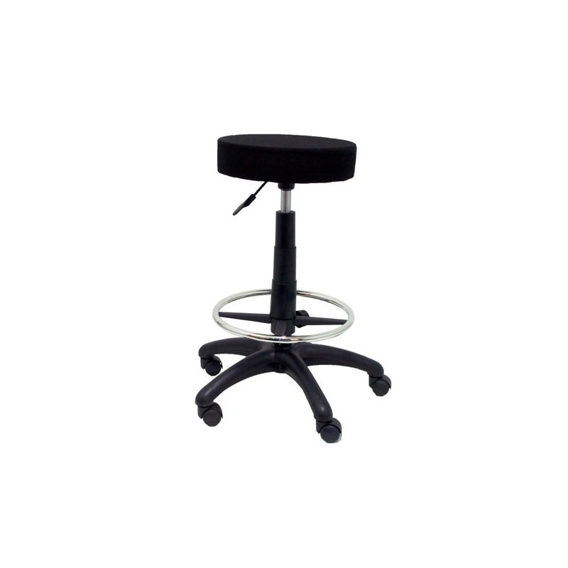 Taburete giratorio, tapizado con espuma de alta densidad. Elevación a gas extra alto. Con aro reposapiés cromado y base de poliamida de 60 cm. de diámetro. Ruedas. Medidas: Asiento 36 cm. de diámetro. Altura máxima: 72 cm mínima: 57 cm. Color negro. Base de 5 radios, con 5 ruedas.