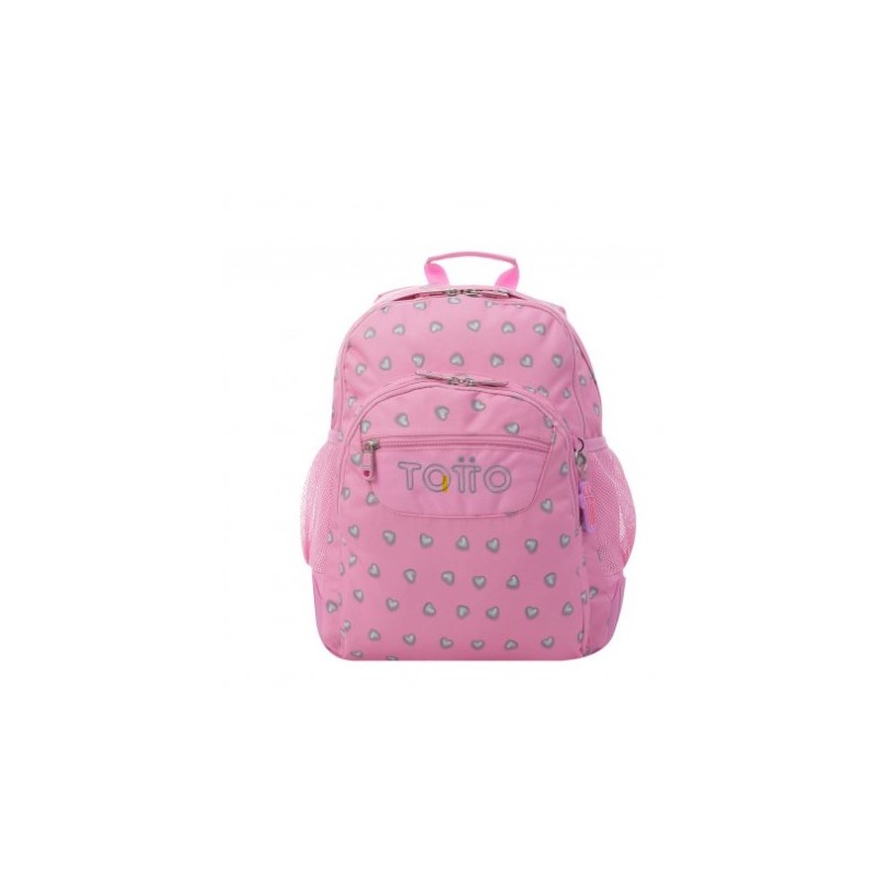 MOCHILA ESCOLAR TOTTO ROSA CORAZONES PLATEADOS CRAYOLES