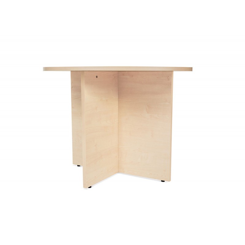 Mesa de reunión circular, con estructura de melamina, pensada para atender a clientes, proveedores, trabajos en grupo, y cubrir las necesidades de reunión, con la intención de mejorar la funcionalidad de su oficina y area de trabajo. Compuesta por estructura melamínica con sistema de regulación independiente (20mm), melamínico sobre aglomerado de 25mm de grosor con canto de PVC de 2 mm de grosor. Acabados en haya, aluminio, blanco y roble. Estructura con cantos redondeados.