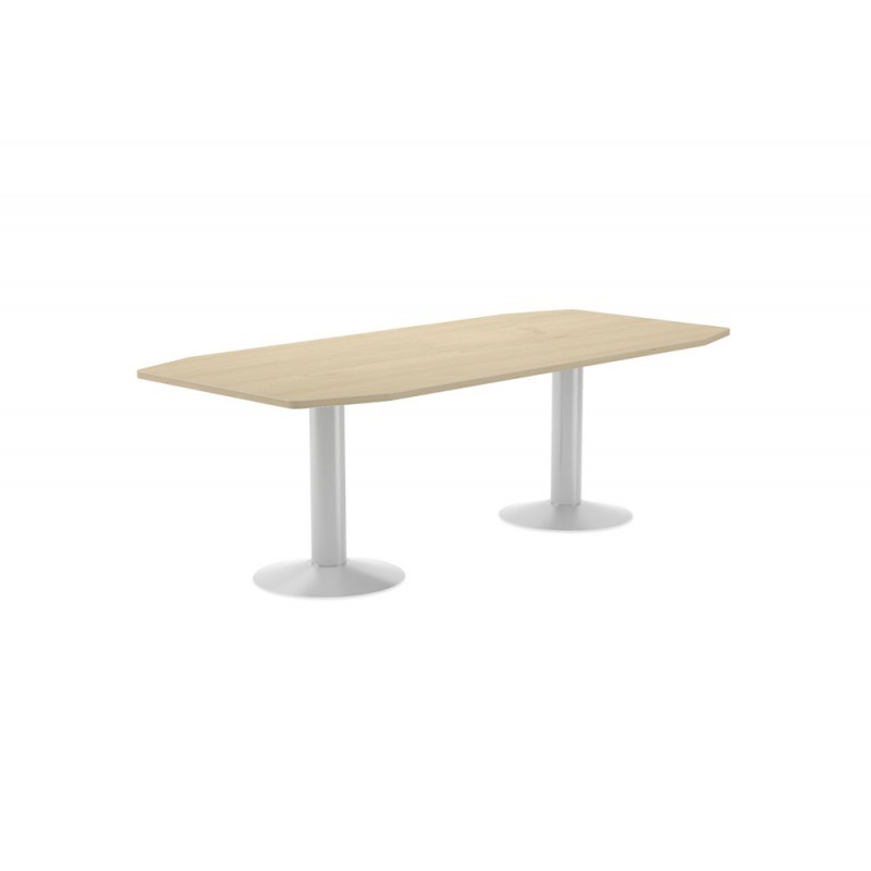 Mesa de reunión con estructura de acero de generosas dimensiones ideal para reunirse con varios integrantes en una sola mesa. Compuesta de pie de columna realizado en plancha metalica pintada epoxy, color según modelo, y 5 acabados de tablero diferentes: haya, gris, blanco, cristal o roble.