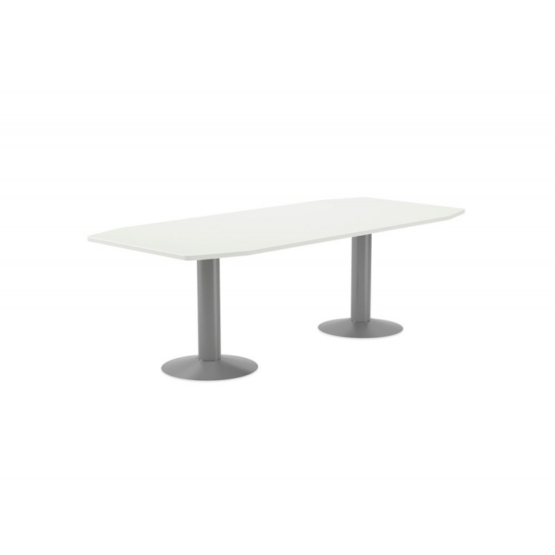 Mesa de reunión con estructura de acero de generosas dimensiones ideal para reunirse con varios integrantes en una sola mesa. Compuesta de pie de columna realizado en plancha metalica pintada epoxy, color según modelo, y 5 acabados de tablero diferentes: haya, gris, blanco, cristal o roble.