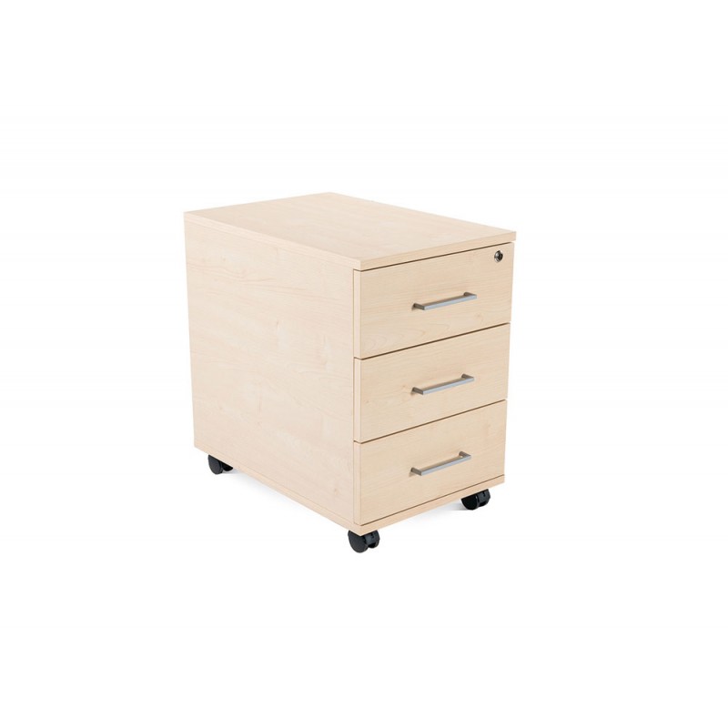 Cajonera de melamina con ruedas de 3 cajones, o 1 cajón y un carpetero según modelo. Estructura realizada en melamina color según modelo de 19mm de espesor con canteado de PVC de 2mm del mismo color. Los interiores de los cajones son metálicos lacados en color negro y los frontales de melamina color según producto de 19mm de espesor con canteado de PVC de 2mm del mismo color. Incluyen guías con rodamientos de nylon, tiradores metálicos y cerradura centralizada. Se incluye sistema antivuelco y ruedas con freno.