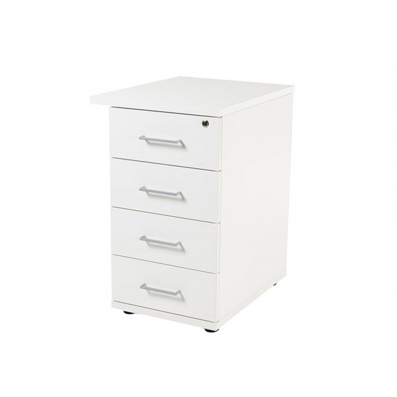 Cajonera de melamina sin ruedas de 3 cajones, o 1 cajón y un carpetero según modelo. Estructura realizada en melamina color según modelo de 19mm de espesor con canteado de PVC de 2mm del mismo color. Los interiores de los cajones son metálicos lacados en color negro y los frontales de melamina color según producto de 19mm de espesor con canteado de PVC de 2mm del mismo color. Incluyen guías con rodamientos de nylon, tiradores metálicos y cerradura centralizada. Se incluye sistema antivuelco.