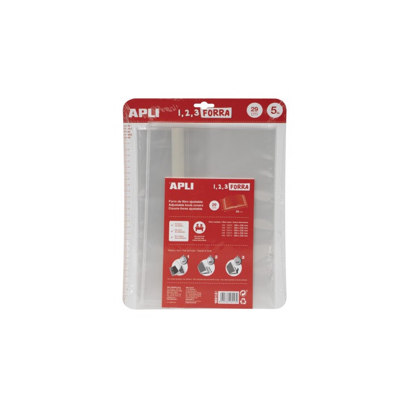 Forro de libros con solapa ajustable PP 290 mm 5 u.Fundas transparentes de polipropileno de 75 micras tamaño 290 mm con solapa autoajustable. Cada blíster contiene 5 fundas. La forma más fácil de forrar libros, cuadernos y carpetas, ya que se adaptan a cada ancho sin necesidad de cortar ni utilizar cinta adhesiva. Forra en solo 3 pasos: 1. Introduce las tapas del libro en las solapas 2. Ajusta el forro cerrando el libro 3. Retira la cinta y pégalo