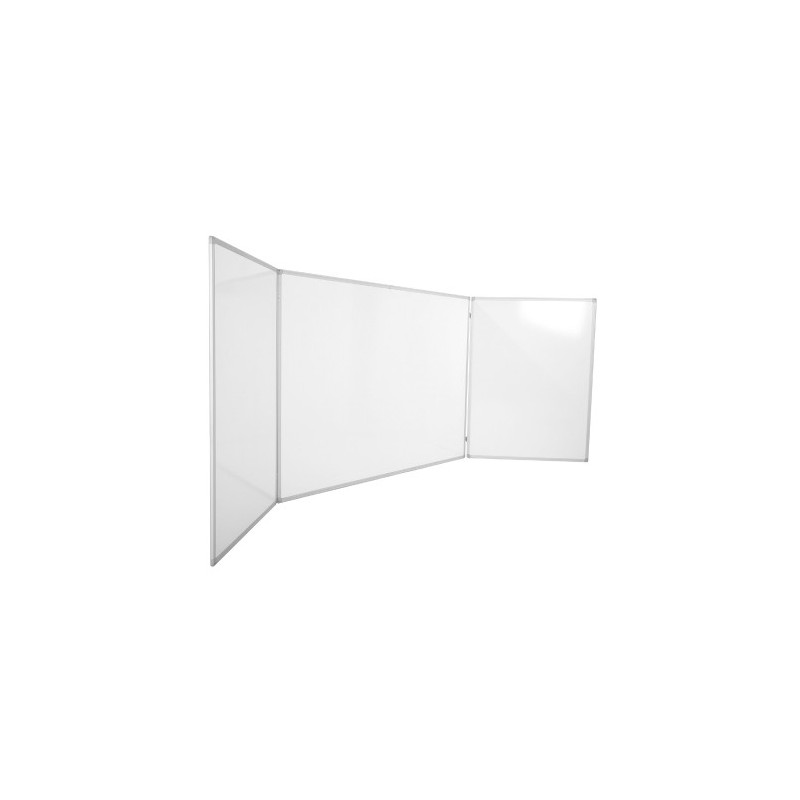Pizarra metálica y magnética tríptica con marco de aluminio anodizado. Superficie blanca vitrificada apta para escritura con rotuladores de borrado en seco. 5 paneles para la escritura. Incluye bandeja para rotuladores y accesorios para la fijación a pared. Viene montada.